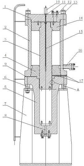 如圖1、2所示,高壓穩(wěn)壓缸,包括底座7,在底座7上設置高壓缸筒5,高壓缸筒5的上方設置油缸筒2,底座7、高壓缸筒5、油缸筒2通過螺栓6連接,在油缸筒2的上方通過短螺栓13連接上油缸蓋1,在高壓缸筒5的上方還設置下油缸蓋4,下油缸蓋4固定在油缸筒2的下端內,在油缸筒2內配合設置活塞14,活塞14上連接活塞桿3,活塞桿3的下端穿過下油缸蓋4后設置在高壓缸筒5內。