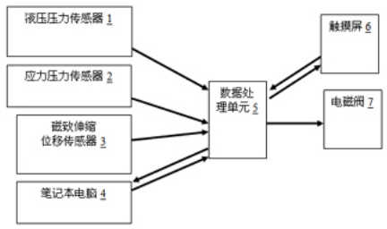 所述壓力傳感器包括液壓壓力傳感器1和應(yīng)力壓力傳感器2。還包括筆記本電腦 4,所述筆記本電腦4連接數(shù)據(jù)處理單元5。壓力機的控制指令可以由筆記本電腦發(fā)出,數(shù)據(jù)處理單元得到指令后,經(jīng)過輸出處理信號控制電磁閥,同時數(shù)據(jù)處理單元實時接收各種傳感器發(fā)送的信息,并能其進行處理分析,開成實時測試曲線,在屏上顯示,并將結(jié)果輸入至筆記本電腦中進行數(shù)據(jù)存儲。