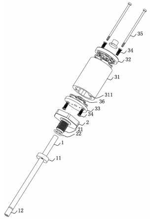 本實(shí)用新型中所提到的底部均指的是桿狀體的較下方部位,類似足部。本實(shí)用新型的磁致伸縮傳感器在安裝后牢固穩(wěn)定,而在出現(xiàn)損壞需拆下時(shí),可僅拆下傳感器頭部3,輕輕轉(zhuǎn)動(dòng)螺柱35便可拆下,拆卸方式靈活簡(jiǎn)便。