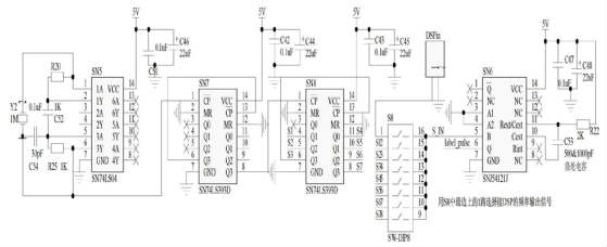 電路中使用晶振和SN74LS04芯片組成震蕩信號源,產(chǎn)生震蕩信號;通過兩片SN74LS393計數(shù)器電路作為分頻器對信號進行分頻處理,并且留有開關(guān)S8以便對輸出頻率進行選擇和設(shè)置。根據(jù)要求,設(shè)計選用SN54121單穩(wěn)態(tài)多諧振蕩器用作單穩(wěn)態(tài)觸發(fā)器,使所得的激勵脈沖信號脈寬可以達到ns級別,并且可以根據(jù)需要調(diào)整脈寬寬度,能夠達到波形快速翻轉(zhuǎn)和穩(wěn)定的效果。本次激勵脈沖脈寬設(shè)置為30us。