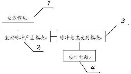 如圖1所示,一種磁致伸縮位移傳感器信號發(fā)射電路,包括:激勵脈沖發(fā)射模塊2和脈沖電流發(fā)射模塊3 ;所述激勵脈沖發(fā)射模塊2和脈沖電流發(fā)射模塊3連接;所述激勵脈沖發(fā)射模塊2將產(chǎn)生的激勵脈沖發(fā)射給所述脈沖電流發(fā)射模塊3,所述脈沖電流發(fā)射模塊3將激勵脈沖轉(zhuǎn)化為脈沖電流并將其發(fā)送給接口電路4。