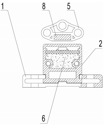如圖1至圖3所示,本實用新型的無接觸式磁塊懸浮型直線位移傳感器,包括固定支架I和與固定支架I連接的殼體2,所述殼體2內(nèi)部安裝有PCB板3,所述PCB板3正中央設(shè)有磁感芯片4 ;所述殼體2上方設(shè)有滑塊5,所述滑塊5與所述殼體2非接觸;所述滑塊5內(nèi)部安裝有磁鋼8 ;所述滑塊5延殼體2橫向水平運動。殼體2兩端用端蓋9封住,所述PCB板3與殼體2之間封裝有環(huán)氧樹脂6,起到絕緣、密封的作用,所述殼體2 —端設(shè)有引出導(dǎo)線7,所述引出導(dǎo)線7與所述PCB板3電氣連接,引出導(dǎo)線7另一端用于連接外部變送器,磁鋼8優(yōu)選為磁能積大的釤鈷磁鋼,磁感芯片4優(yōu)選為霍爾芯片。
