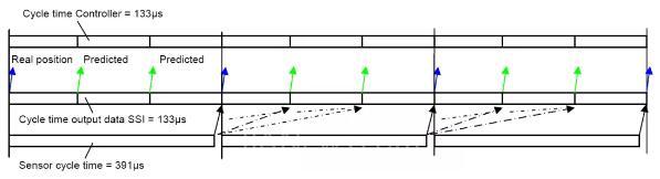 圖中可見,控制器詢問周期快于位移傳感器測量周期,因此綠色箭頭部分的位置值是通過最新的藍色箭頭測量疊加計算值后給出的傳感器位置,以適應高速的控制器循環(huán)周期。
