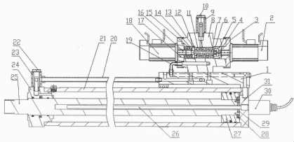 液壓缸的缸底31的外壁設(shè)置有磁致伸縮位移傳感器30,傳感器30與液壓缸的缸底31螺紋連接,活塞桿25的中心處設(shè)有測試孔,磁致伸縮位移傳感器30的測桿26活動的插入在測試孔中,磁致伸縮位移傳感器30的磁環(huán)28固定套裝在活塞桿25上,且位于活塞27的端部。磁致伸縮位移傳感器30的作用是檢測出液壓缸的活塞桿25運動的位移量,反饋給與第二電機18相應(yīng)的驅(qū)動器。