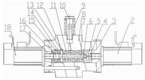 在滑閥閥體8的兩端對稱設(shè)有第一電機2和第二電機18,第一電機2通過右端蓋3用螺釘與閥體8連接,其電機軸通過聯(lián)軸節(jié)4與閥芯7的一端連接,第二電機18通過左端蓋17用螺釘與閥體8連接,其電機軸插入到反饋螺套16的一端,并通過緊定螺釘與反饋螺套16固定連接。第一電機2控制滑閥的閥芯7運動,第二電機18控制滑閥的反饋螺套16運動。