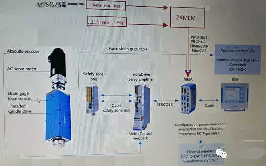 整個電氣系統(tǒng)如下:圖示中X軸和Y軸是MEM(測量評估模塊)的兩個輸入通道,一般該類模塊通常接受SSI、模擬量、AB相信號,考慮到客戶對精度的要求,為客戶推薦的SSI信號的磁致伸縮位移傳感器,該傳感器最高分辨率可達0.5μm,送往系統(tǒng)的數(shù)據(jù)是超過10KHZ的額外采樣頻率。