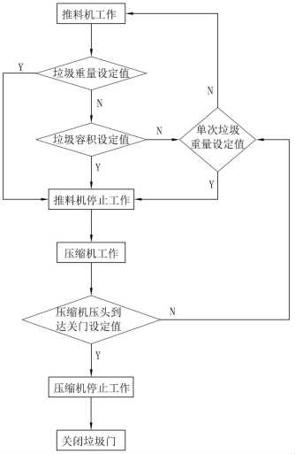 垃圾壓縮機控制系統(tǒng)是為實現(xiàn)垃圾密閉式垃圾壓縮轉運而設計,垃圾壓縮機控制系統(tǒng)通過控制推料機向壓縮機內推料,推料到一定量后壓縮機開始向壓縮腔或垃圾箱內壓料,壓料后退回,如此往復,直到壓縮機壓料達到設定壓力即認為垃圾箱已壓滿,壓縮機關閉箱門,壓裝完成。這種控制系統(tǒng)容易導致垃圾量控制不好出現(xiàn)壓多裝多或者虧載現(xiàn)象。因此,為了避免現(xiàn)有技術中存在的缺點,提供一種提高垃圾壓縮重量和體積精度控制的預壓濾水式垃圾壓縮機控制系統(tǒng)。