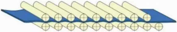 輥式整平機工作時主要是靠上下輥筒錯位間隙來完成對彎曲板材的矯正,當(dāng)板材被送入上下輥之間時,分別使板料向上和向下彎曲,鋼板經(jīng)過多次的拉伸彎曲后,原來張力較大的部位被拉伸,消除內(nèi)部應(yīng)力,達到矯正和整平的目的。