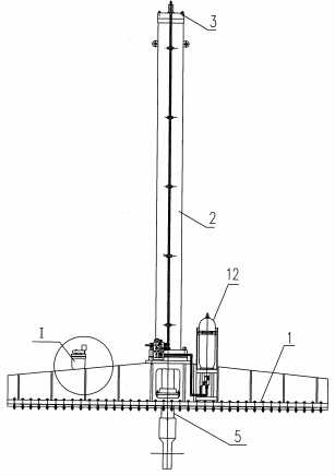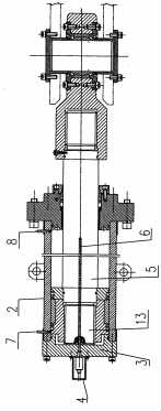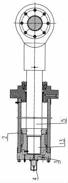 如圖1、2、3、4所示,本實用新型所述用于閘閥式工作閘門的液壓啟閉機,它包括機架1,垂直向下設置在所述機架1上的液壓油缸2、氣囊式蓄能器12 ;氣囊式蓄能器12通過安全閥組與液壓油缸2的有桿腔相連通。在液壓油缸2缸體上端蓋3的防護罩4內設置有磁致伸縮位移傳感器,該位移傳感器的測量磁環(huán)固定套裝在液壓油缸2的活塞13上,磁致伸縮位移傳感器的測量磁棒6延伸至活塞桿5中心測量孔中; 在油缸缸體側壁上、下端設置有兩電感式耐高壓接近開關7、8 ;電感式耐高壓接近開關7、8分別對應于液壓油缸2的活塞13上、下行程極限位置;在機架1上設置有自動進排氣裝置,自動進排氣裝置由自上而下相互連通的污水復合排氣閥9、緩沖塞閥10、截止閥11構成,截止閥11的一個閥口與閘門井頂部相連通。