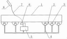 磁致伸縮位移傳感器的液壓車載噸位儀,其組成包括:車架1及安裝在車架上的一組減震弓片2, 車架與所述的減震弓片之間分別安裝液壓油缸3,各個液壓油缸的出液管4 都連接主油缸5,主油缸上安裝磁致伸縮位移傳感器6,位移傳感器通過數(shù)據(jù)線7連接安裝在駕駛室里面的顯示屏8。