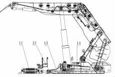 圖中,1.電纜接頭;2.波導(dǎo)管;3.殼體;4.電纜;5.磁環(huán);6.電子倉;7. 推移千斤頂后蓋;8.位移傳感器;9.推移千斤頂活塞桿;10.推移千斤頂缸體; 11.刮板機;12.支架推移桿;13.推移千斤頂;14.液壓支架。