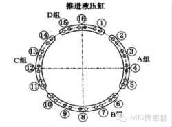 盾構機推進缸數(shù)量較多,一般采用分組控制,即將推進缸按照圓周均勻分為幾組,每組安裝1-2支傳感器,這樣不僅節(jié)約成本,同時也減小了系統(tǒng)的復雜程度。如圖: