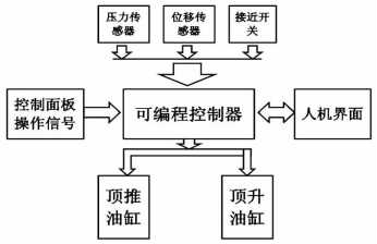 本實(shí)用新型提供的這種包括用于驅(qū)動(dòng)臺(tái)車走行的動(dòng)力機(jī),還包括PLC及與該P(yáng)LC 連接的壓力傳感器、磁致伸縮位移傳感器、接近開關(guān)、控制面板,所述動(dòng)力機(jī)均采用油缸,控制面板給 PLC操作信號(hào),由PLC控制所述油缸的動(dòng)作,在檢測(cè)到傳感器工作都正常的前提下,驅(qū)動(dòng)所述油缸走行動(dòng)作。