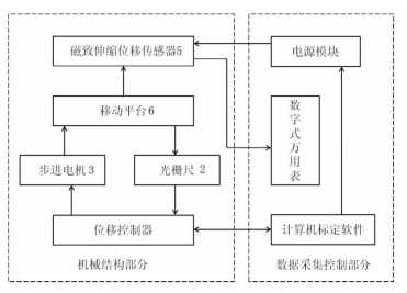 在標(biāo)定時,被標(biāo)定的磁致伸縮位移傳感器5安裝在傳感器安裝平臺4上,用于標(biāo)定的磁環(huán)固定在移動平臺6上,磁致伸縮位移傳感器5的信號線直接連接到數(shù)據(jù)采集控制器部分的電源模塊和數(shù)字式萬用表的輸入端,啟動標(biāo)定系統(tǒng)后首先找到被標(biāo)定磁致伸縮位移傳感器的零點(diǎn)位置,然后設(shè)定系統(tǒng)標(biāo)定參數(shù),標(biāo)定系統(tǒng)自動完成磁致伸縮位移傳感器的標(biāo)定。