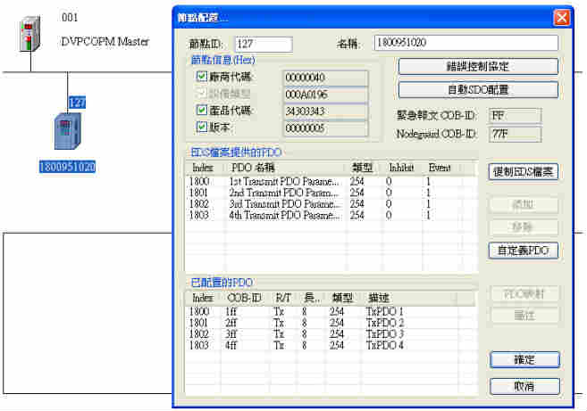 5. 在CAN 總線配置軟體中, 為 CAN 總線主站配置 PDO 物件。