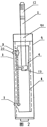 參見圖2和圖3,本實(shí)用新型的自復(fù)位微位移傳感器包括殼體9、測(cè)量桿1、滑輪2、復(fù)位彈簧3、電刷4、移動(dòng)卡瓦5、長(zhǎng)條形電阻體6,以及設(shè)置在殼體9外壁上的固定支架8。其中,殼體9的前端開有通孔90,測(cè)量桿1經(jīng)由通孔90可活動(dòng)地設(shè)置在殼體9內(nèi)。通孔90的內(nèi)徑與測(cè)量桿1的外徑應(yīng)設(shè)置成使測(cè)量桿1能沿殼體9的軸向、在殼體9內(nèi)外作直線運(yùn)動(dòng)。移動(dòng)卡瓦5和電刷4,例如通過焊接設(shè)置在測(cè)量桿1的底端10上,電阻體6貼置在殼體1內(nèi)壁上能與電刷4保持活動(dòng)接觸的位置上,其長(zhǎng)度方向沿殼體1的軸向。電阻體6例如可采用導(dǎo)電塑料基體;電刷4例如可采用銅片,利用其自身的彈性使與電阻體6保持良好的活動(dòng)接觸。靠近殼體9前、后端的內(nèi)壁上還例如通過鉚接分別設(shè)置一個(gè)用以安裝滑輪2的滑輪心軸20和彈簧固定基準(zhǔn)7。復(fù)位彈簧3嵌套在滑輪2的槽內(nèi),其一端固定在彈簧固定基準(zhǔn)7上,另一端固定在測(cè)量桿1的底端10上,利用其收縮力使測(cè)量桿的測(cè)量端12伸出殼體9外。當(dāng)測(cè)量端12感受到被測(cè)對(duì)象的位移,并通過測(cè)量桿1帶動(dòng)電刷4在電阻體6表面上滑動(dòng)時(shí),即可改變電刷4與電阻體6端點(diǎn)之間的電阻值。通過在電刷4上和電阻體6兩端點(diǎn)的至少一個(gè)端點(diǎn)上,各接出一根導(dǎo)線連接到測(cè)量?jī)x表上,即可將測(cè)得的位移量轉(zhuǎn)換為模擬電信號(hào)傳送到測(cè)量?jī)x表。